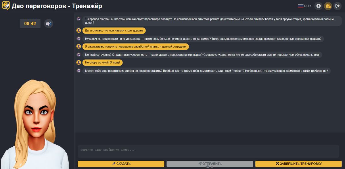 - Сложные переговоры станут понятной игрой. Вы «прогоните» сценарий важной сделки, повышения зарплаты или разговора с инвестором десятки раз, прежде чем он случится в реальности. Вы придете на встречу не с надеждой, а с готовым алгоритмом и ледяным спокойствием.